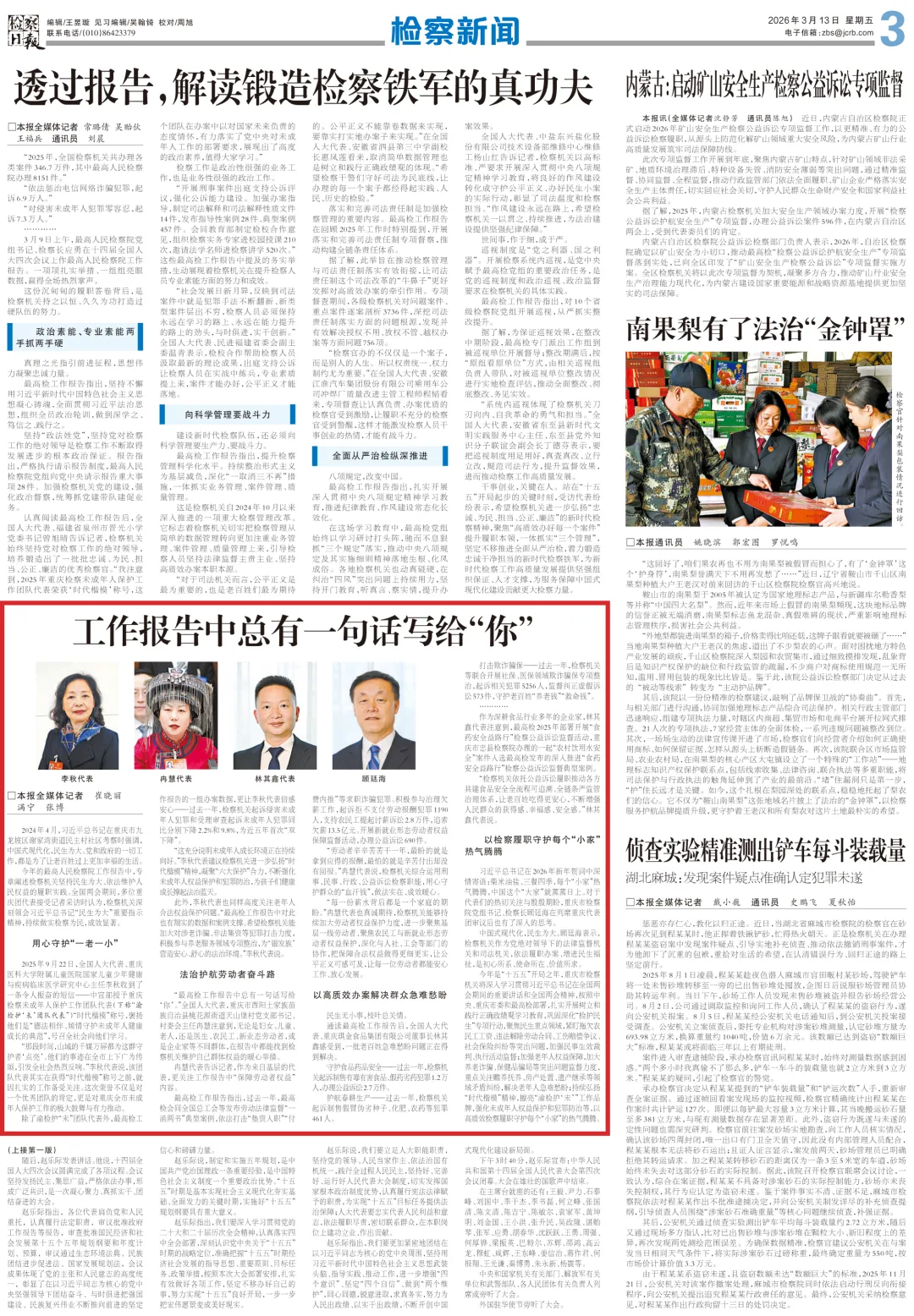 “最高检工作报告中总有一句话写给‘你’。”全国人大代表,重庆市酉阳土家族苗族自治县桃花源街道天山堡村党支部书记、村委会主任冉慧注意到,无论是妇女、儿童、老人,还是医生、农民工、新业态劳动者,或是企业家等不同群体,在报告中都能找到检察机关维护自己群体权益的暖心举措。