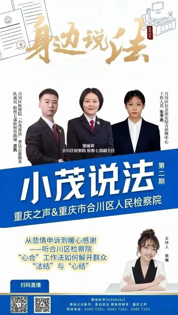 3月18日,《重庆之声·身边说法》栏目邀请合川区检察院“心合”工作室检察官梁丽莉、“小茂说法”普法志愿服务队成员苗凯,携手合川区社会治安综合治理中心工作人员张季凇,讲述了一起申诉案件背后的故事一一女儿在一起交通事故中不幸离世,母亲不服法院判决,向合川区检察院申诉。该院运用“心合”工作法一步步解开了母亲心中的“法结”与“心结”,最终实现了“案结事了、事心双解”。