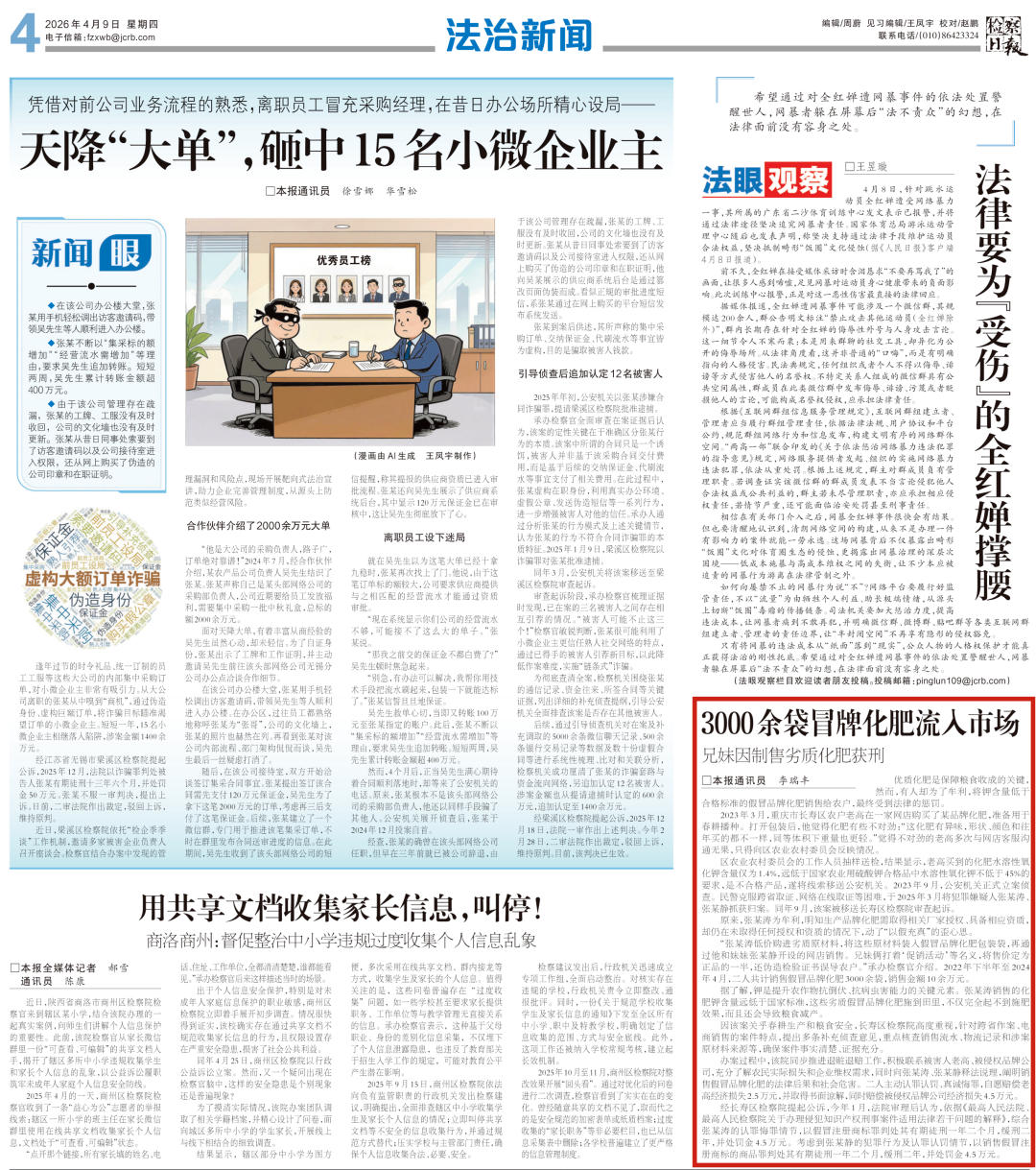 “张某涛低价购进劣质原材料,将这些原材料装入假冒品牌化肥包装袋,再通过他和妹妹张某静开设的网店销售。兄妹俩打着‘促销活动’等名义,将售价定为正品的一半,还伪造检验证书误导农户。”承办检察官介绍。2022年下半年至2024年4月,二人共计销售假冒品牌化肥3000余袋,销售金额10余万元。