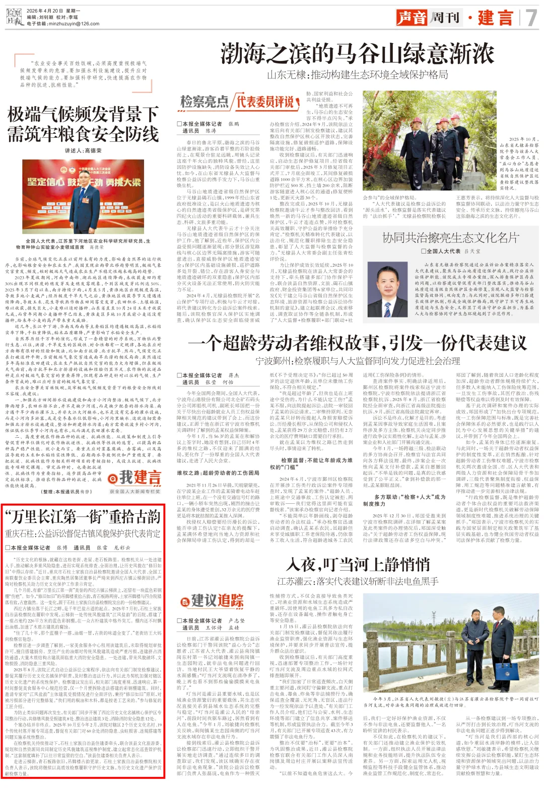 2026年4月20日,《检察日报》第7版刊登《“万里长江第一街”重拾古韵——重庆石柱:公益诉讼督促古镇风貌保护获代表肯定》一文,内容如下: