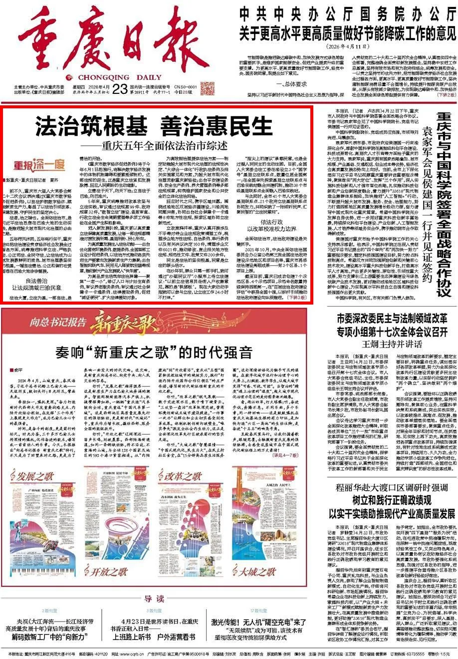 2026年4月23日,《重庆日报》头版头条转第3版刊登《法治筑根基 善治惠民生——重庆五年全面依法治市综述》一文,其中,对188体育