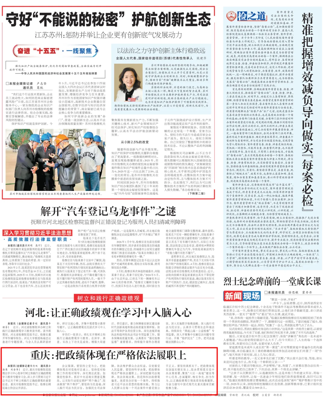 2026年4月20日,《检察日报》头版刊登《重庆:把政绩体现在严格依法履职上》一文,内容如下: