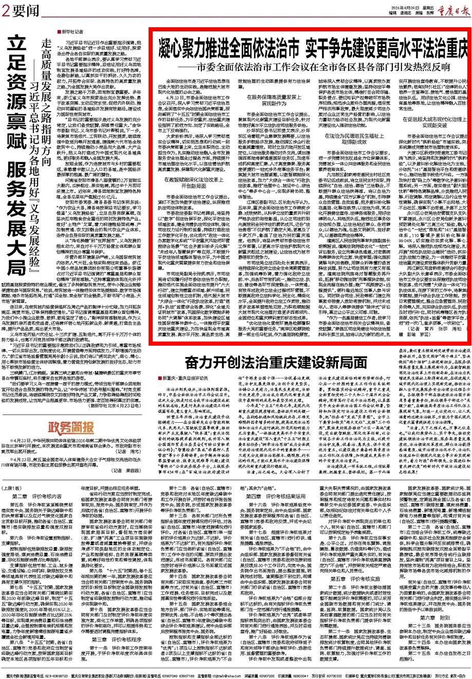 2026年4月24日,《重庆日报》第2版刊登《凝心聚力推进全面依法治市 实干争先建设更高水平法治重庆——市委全面依法治市工作会议在全市各区县各部门引发热烈反响》一文,内容如下: