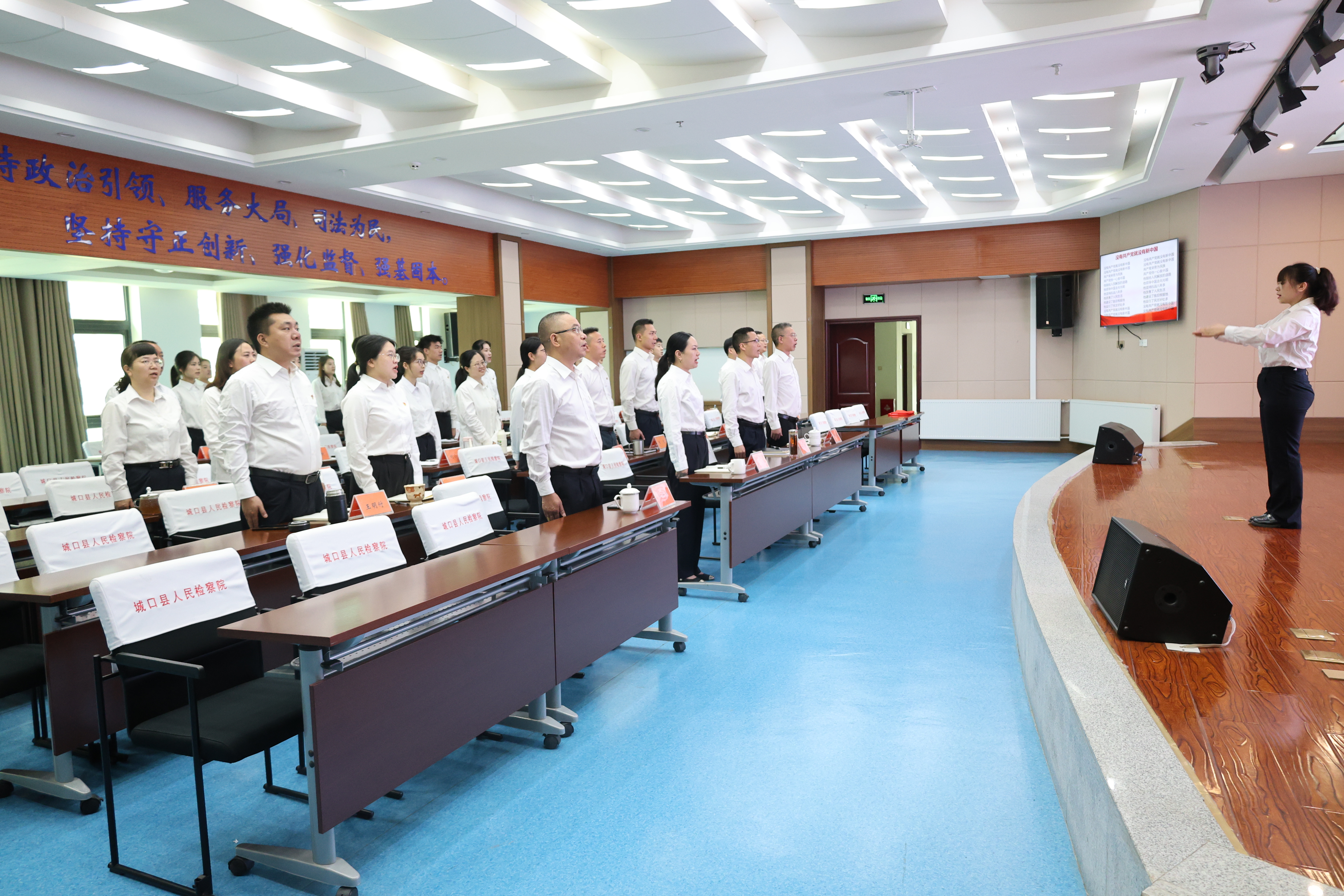 入党誓词铿锵回荡,全体党员紧握右拳的手缓缓放下。随后,熟悉的旋律响起,大家齐声高唱《没有共产党就没有新中国》,激昂歌声中,初心与使命在检察蓝的方阵里愈发鲜明。