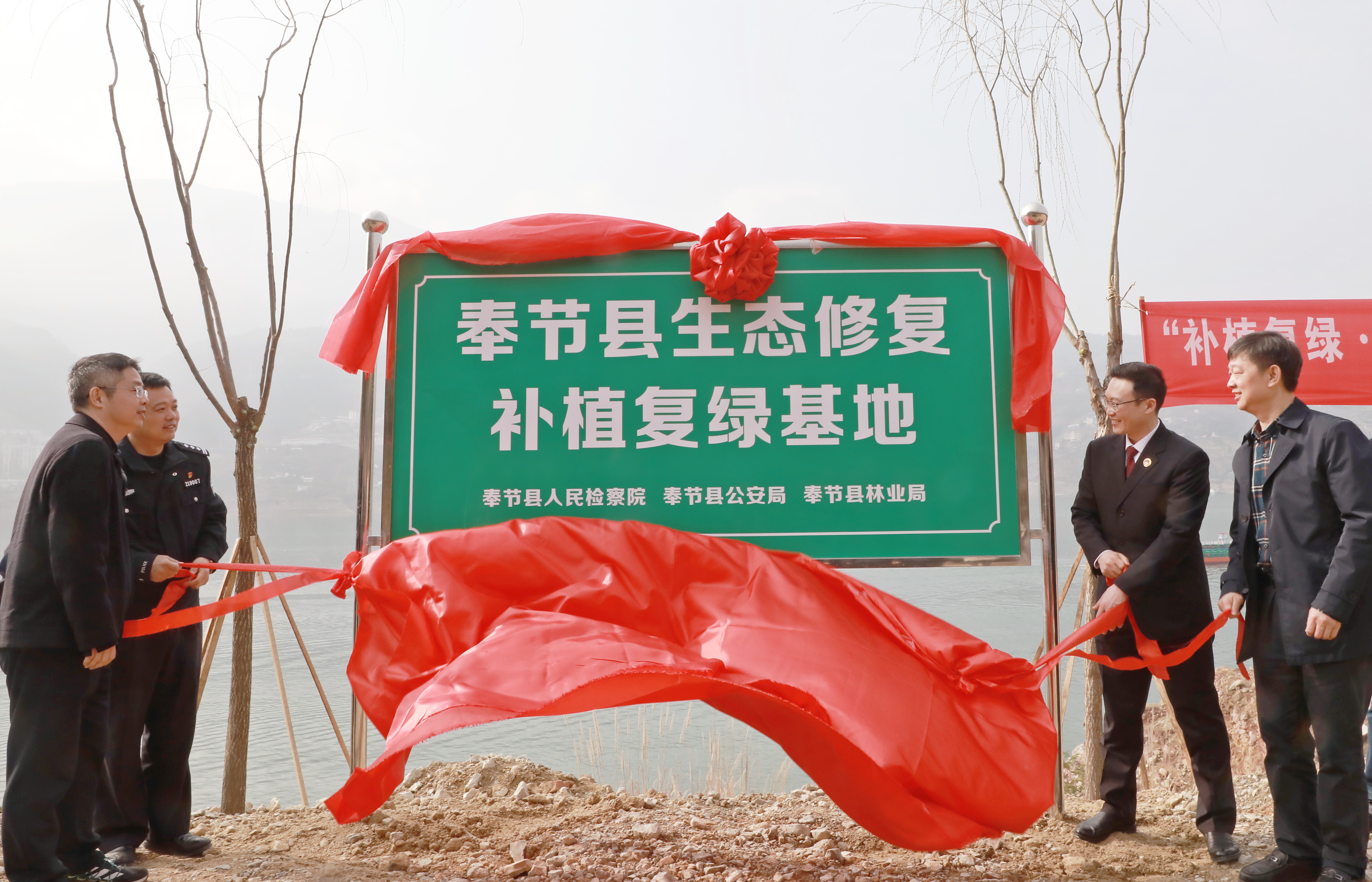 奉节县检察院党组书记、检察长庞伟华,县林业局党组书记、局长肖功勋,县公安局党委委员、副局长梁剑,县政协提案委员会主任陈辉清共同为“奉节县生态修复补植复绿基地”揭牌。市人大代表、县政协委员、人民监督员及相关部门同志参加。