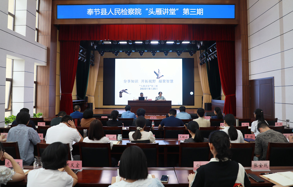为提升干警公文写作能力,练好公文写作基本功,助推干警学思践悟、争当“头雁”,8月25日,奉节县检察院举办2023年第三期“头雁讲堂”,邀请西南大学杨晓河副教授为奉节县检察院全体干警作题为《从基础写作角度审视公文写作》专题讲座。奉节县检察院在家班子成员、全体干警、聘用制书记员参加。