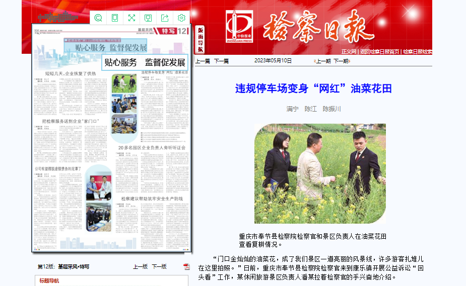“门口金灿灿的油菜花,成了我们景区一道亮丽的风景线,许多游客扎堆儿在这里拍照。”日前,重庆市奉节县检察院检察官来到康乐镇开展公益诉讼“回头看”工作,某休闲旅游景区负责人潘某拉着检察官的手兴奋地介绍。