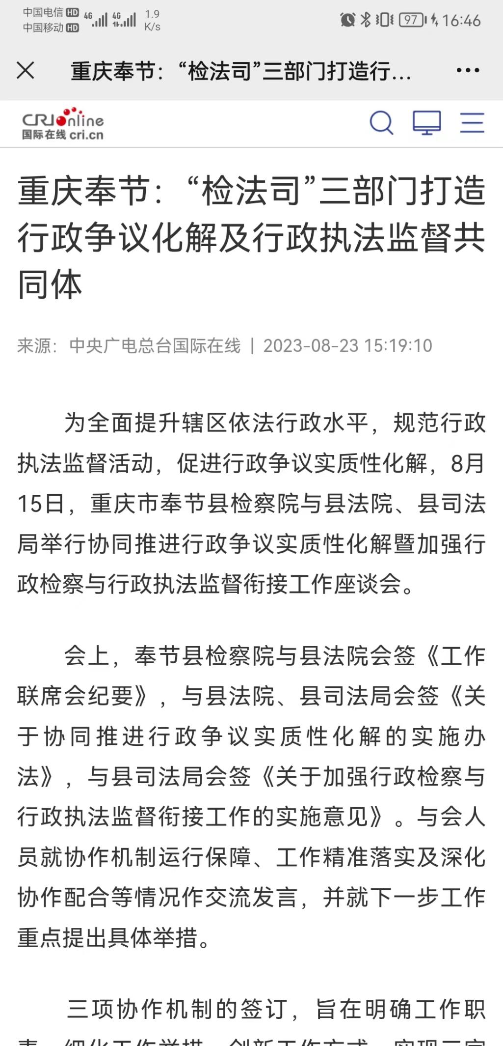 为全面提升辖区依法行政水平,规范行政执法监督活动,促进行政争议实质性化解,8月15日,重庆市奉节县检察院与县法院、县司法局举行协同推进行政争议实质性化解暨加强行政检察与行政执法监督衔接工作座谈会。