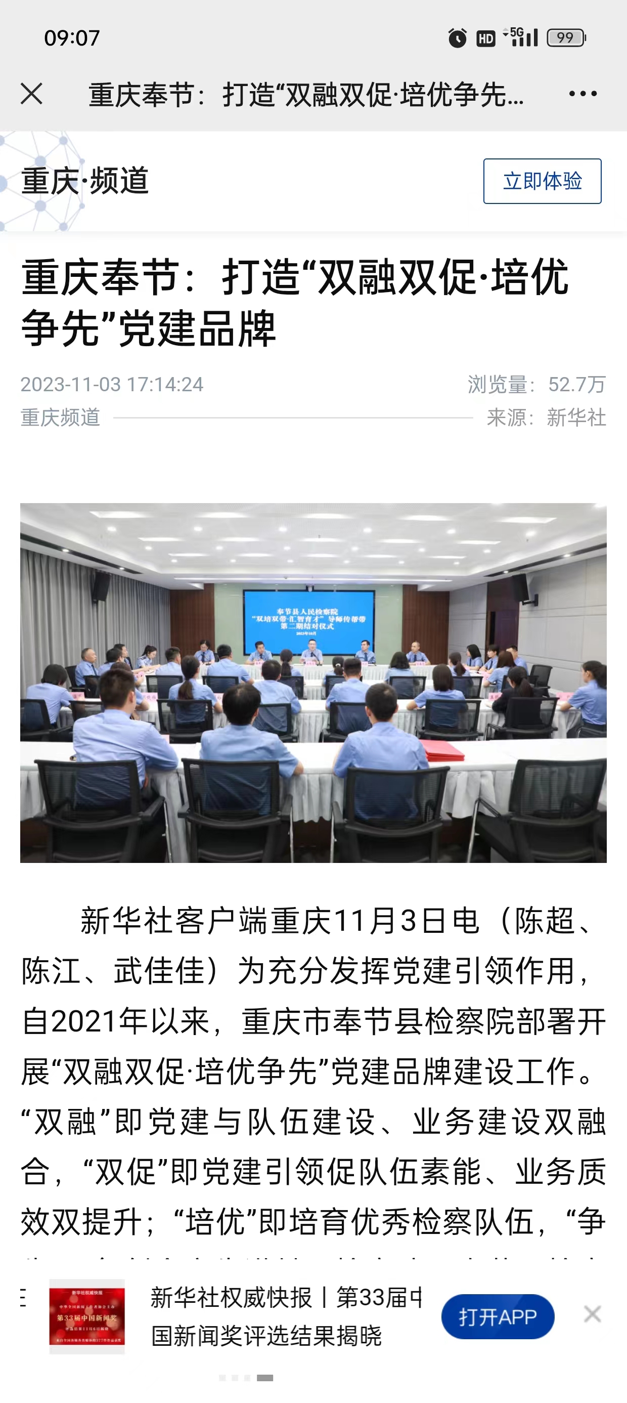 新华社客户端重庆11月3日电(陈超、陈江、武佳佳)为充分发挥党建引领作用,自2021年以来,重庆市奉节县检察院部署开展“双融双促·培优争先”党建品牌建设工作。“双融”即党建与队伍建设、业务建设双融合,“双促”即党建引领促队伍素能、业务质效双提升;“培优”即培育优秀检察队伍,“争先”即争创全市先进基层检察院。奉节县检察院在不断深化“党建+”的过程中,充分调动、培养、凝聚队伍的积极性、创造性和协同性,为检察业务工作注入源头活水,推动奉节检察工作提质增效、争先进位。