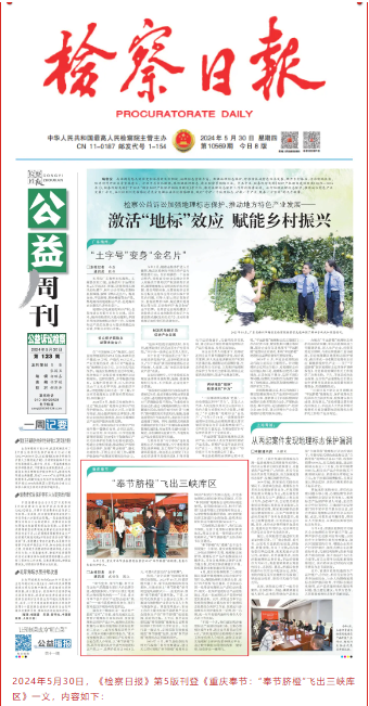 2024年5月30日,《检察日报》第5版刊登《重庆奉节:“奉节脐橙”飞出三峡库区》一文,内容如下: