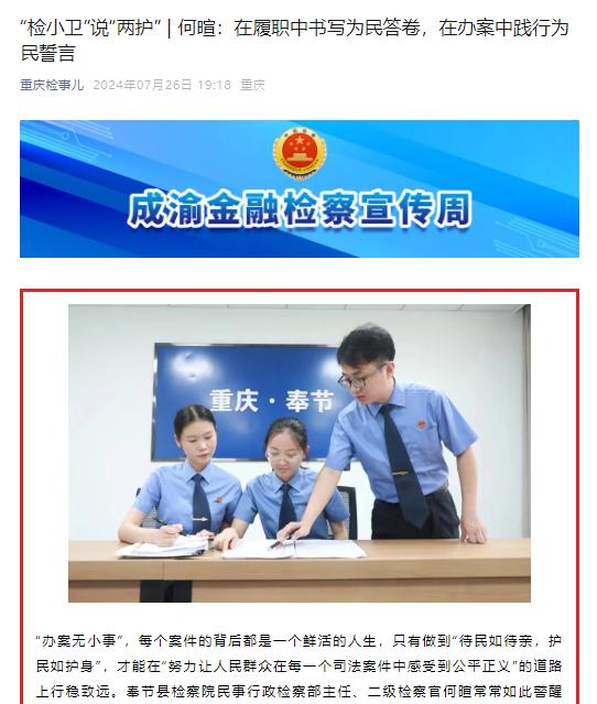 “办案无小事”,每个案件的背后都是一个鲜活的人生,只有做到“待民如待亲,护民如护身”,才能在“努力让人民群众在每一个司法案件中感受到公平正义”的道路上行稳致远。奉节县检察院民事行政检察部主任、二级检察官何暄常常如此警醒自身。