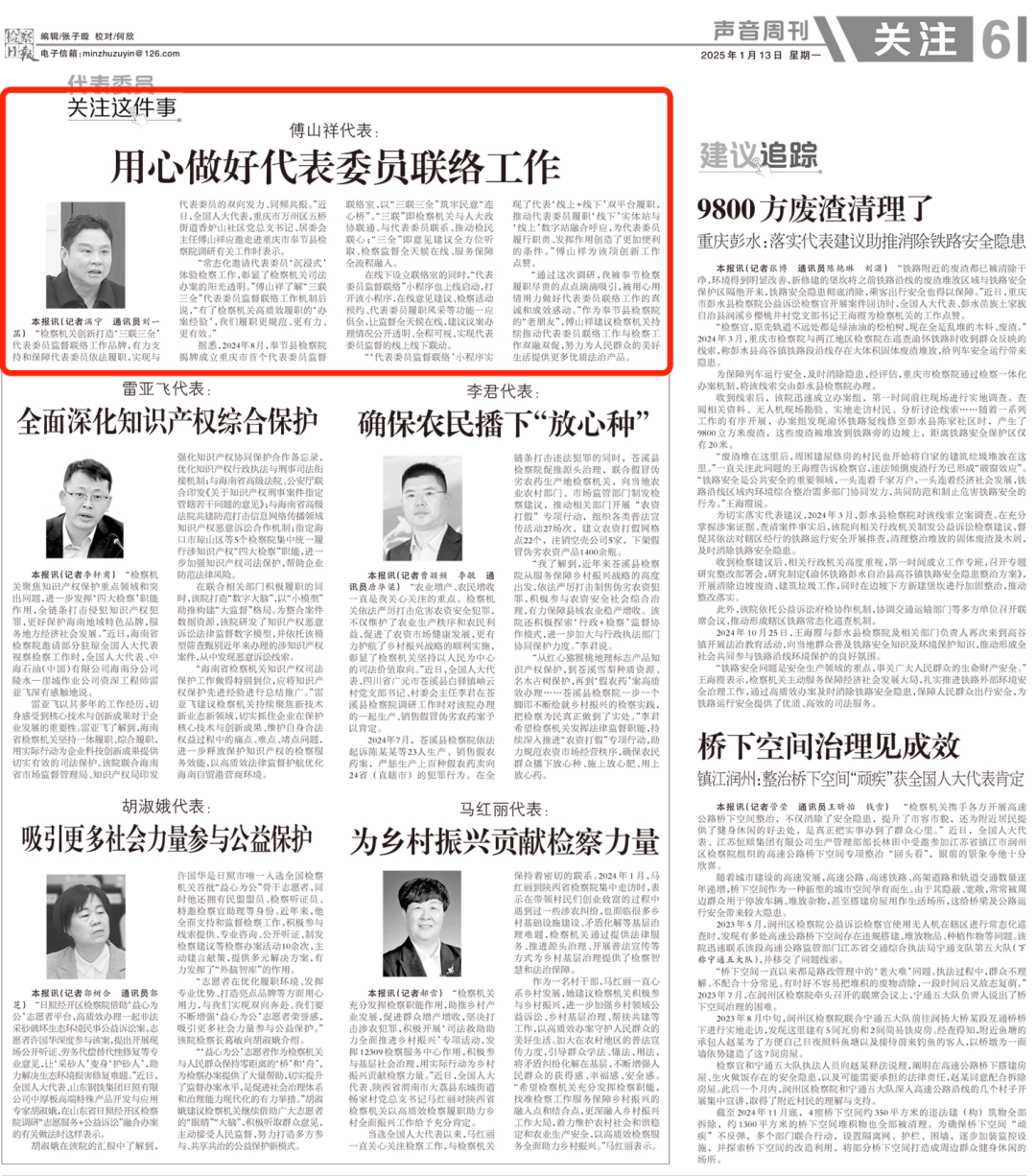 2025年1月13日,《检察日报》第6版刊登《傅山祥代表:用心做好代表委员联络工作》一文,内容如下: