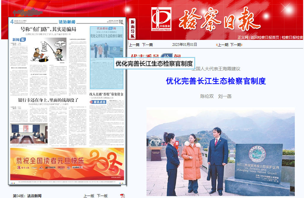 2025年1月1日,《检察日报》第4版刊登《全国人大代表王海霞建议:优化完善长江生态检察官制度》一文,内容如下: