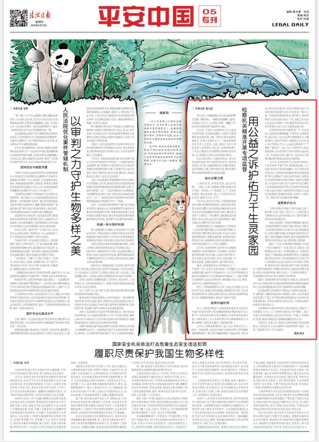 2024年5月23日,《法治日报》第5版刊登《用公益之诉护佑万千生灵家园——检察机关精准开展专项监督 》一文,其中对重庆市开州区检察院依法能动履职融入外来入侵物种治理、促进生物多样性的相关做法进行了报道,内容如下: