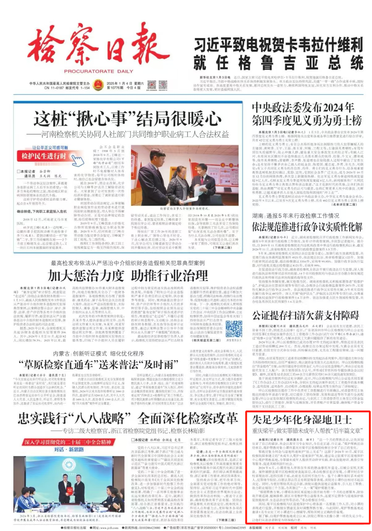 2025年1月4日,《检察日报》头版刊登《失足少年化身湿地卫士——重庆梁平:做实罪错未成年人帮教“后半篇文章” 》一文,内容如下:
