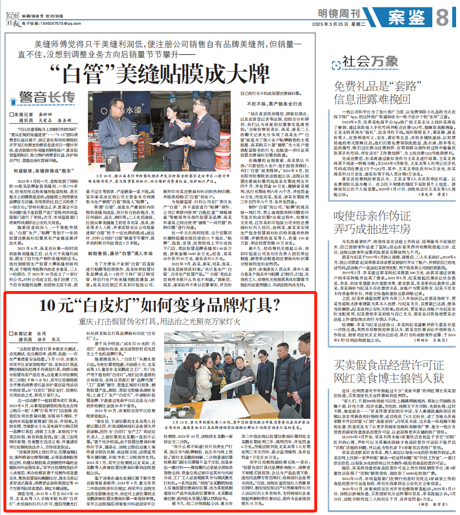 2025年3月25日,《检察日报》第8版刊登《10元“白皮灯”如何变身品牌灯具?——重庆:打击假冒伪劣灯具,用法治之光照亮万家灯火》一文,内容如下: