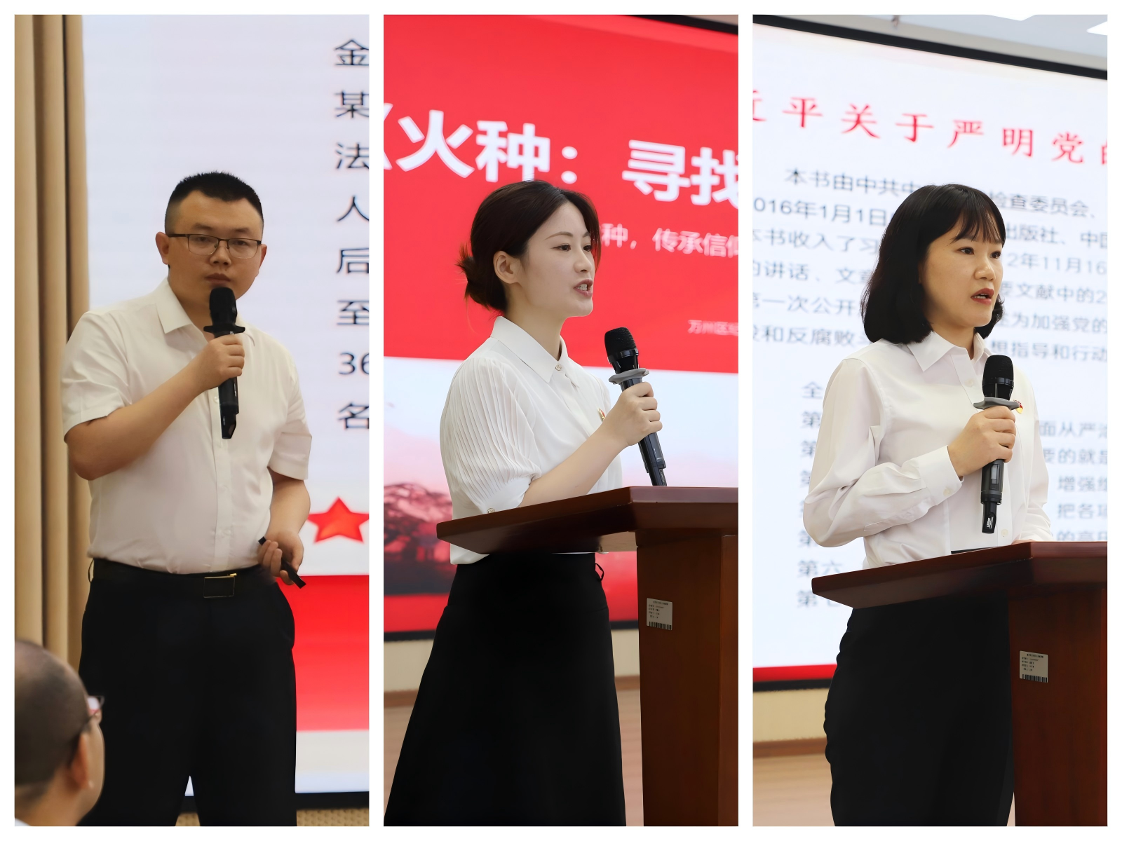 我院干警罗贵林(左)展示微型业务课、区纪委监委干部谭容(中)、我院干警姜小青(右)开展读书分享
