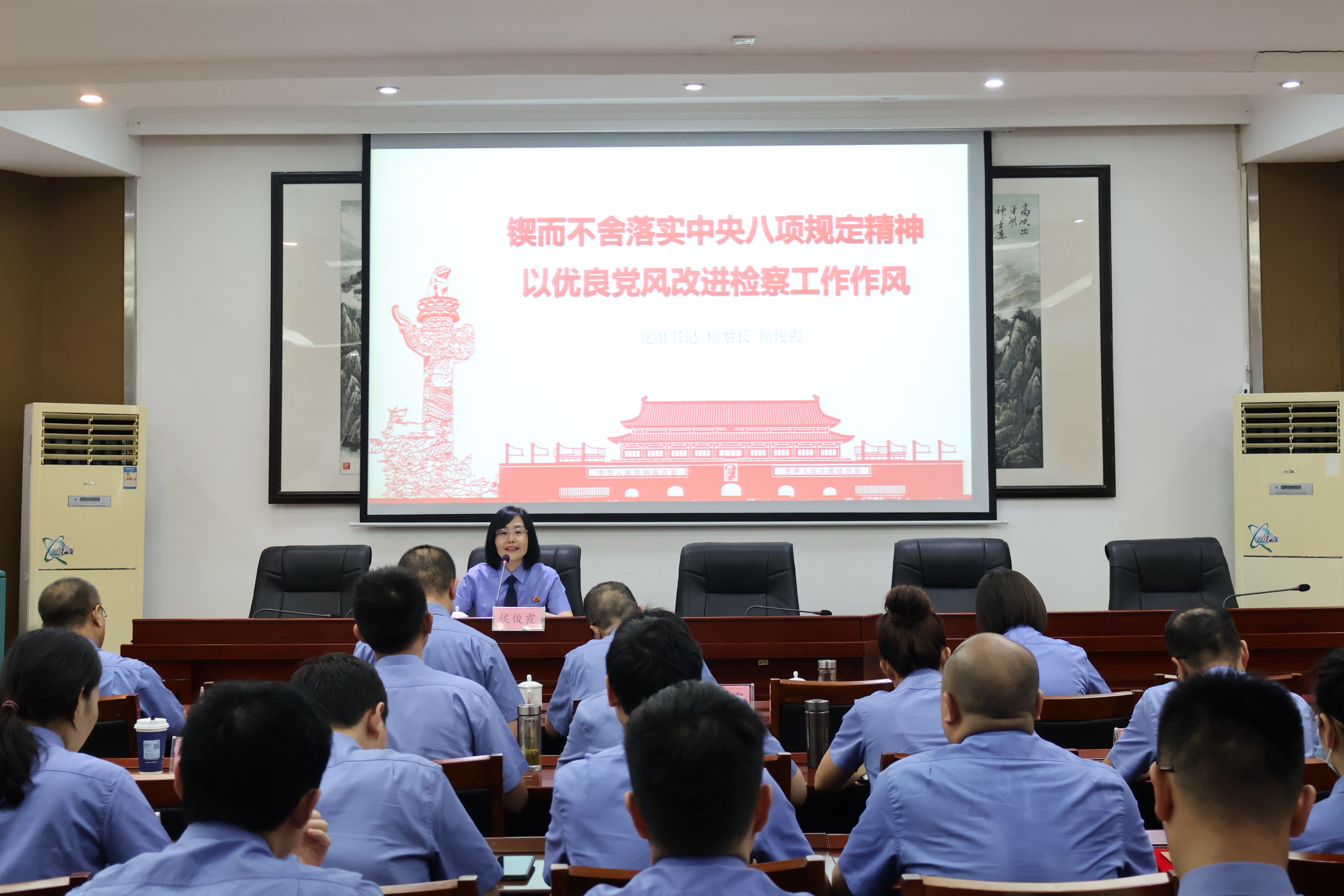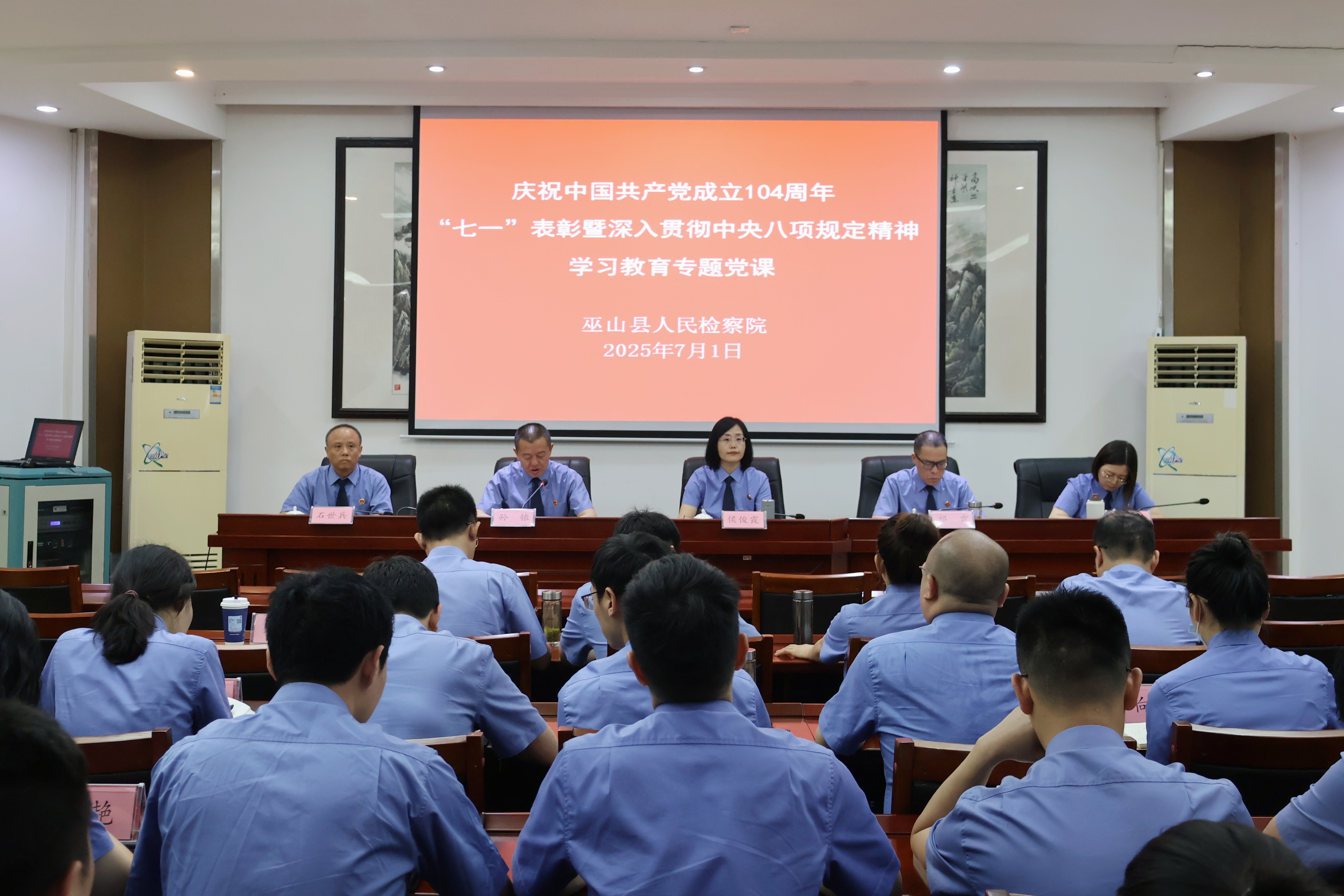 为庆祝中国共产党成立104周年,推动深入贯彻中央八项规定精神学习教育入心入脑,7月1日,我院召开“七一”表彰大会暨检察长讲专题党课。会议由院党组成员、政治部主任孙铱主持,全院干警参加。