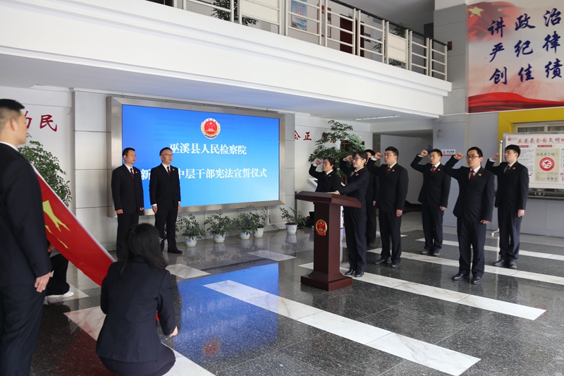 3月10日上午,我院举行新任中层干部宪法宣誓仪式。院党组书记、检察长阮能文监誓,院党组成员、政治部主任黄元波主持宣誓仪式。8名新提任中层干部在国旗下郑重宣誓:“忠于中华人民共和国宪法,维护宪法权威,履行法定职责,忠于祖国、忠于人民,恪尽职守、廉洁奉公,接受人民监督,为建设富强民主文明和谐美丽的社会主义现代化强国努力奋斗!”