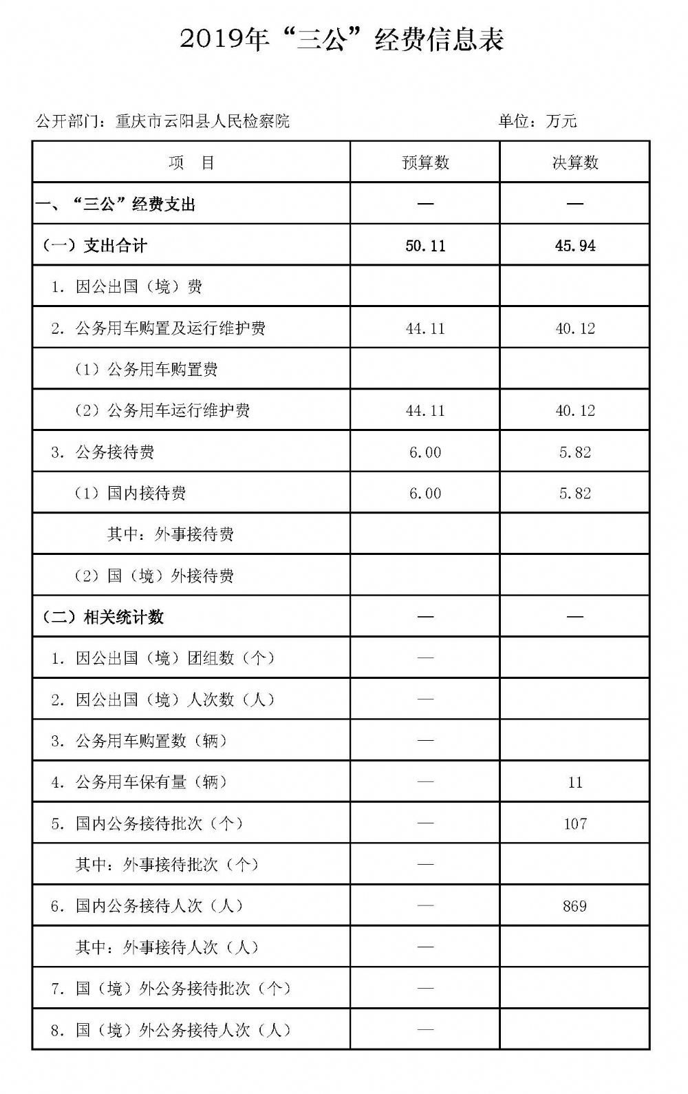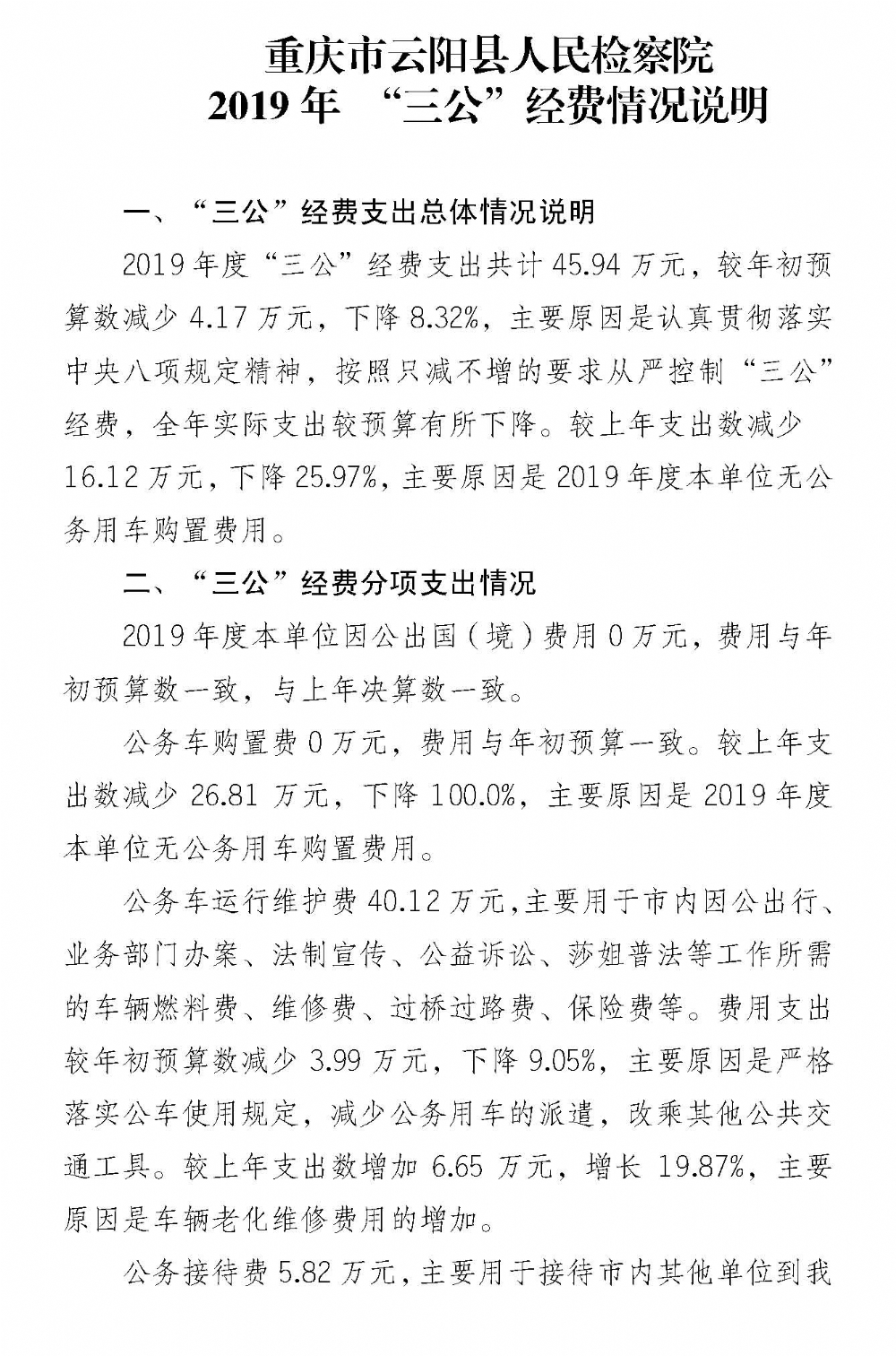 重庆市云阳县人民检察院2019年度“三公”经费公开