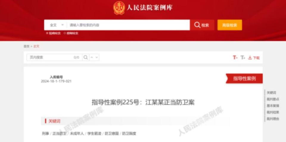 2024年6月1日,“两高”等8家单位共同建设的未成年人权益保护案事例库正式上线。目前,收录已收录4400余篇案例,指导性案例“江某某正当防卫案”入选。 官网截图