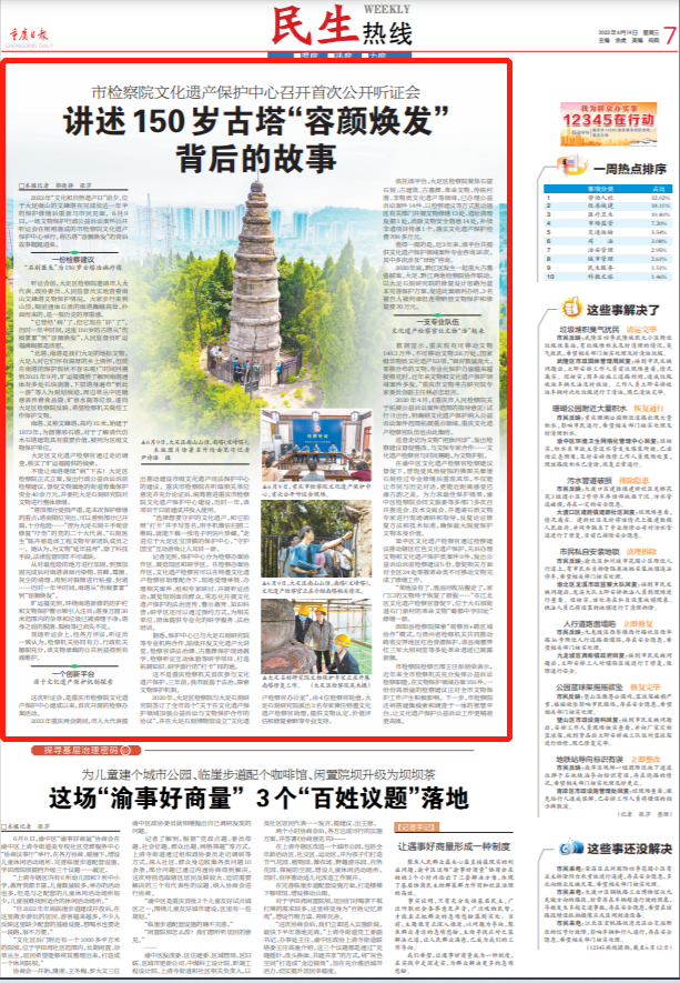 2023年6月14日,《重庆日报》第7版半版刊登《188体育 文化遗产保护中心召开首次公开听证会 讲述150岁古塔“容颜焕发”背后的故事》一文,内容如下: