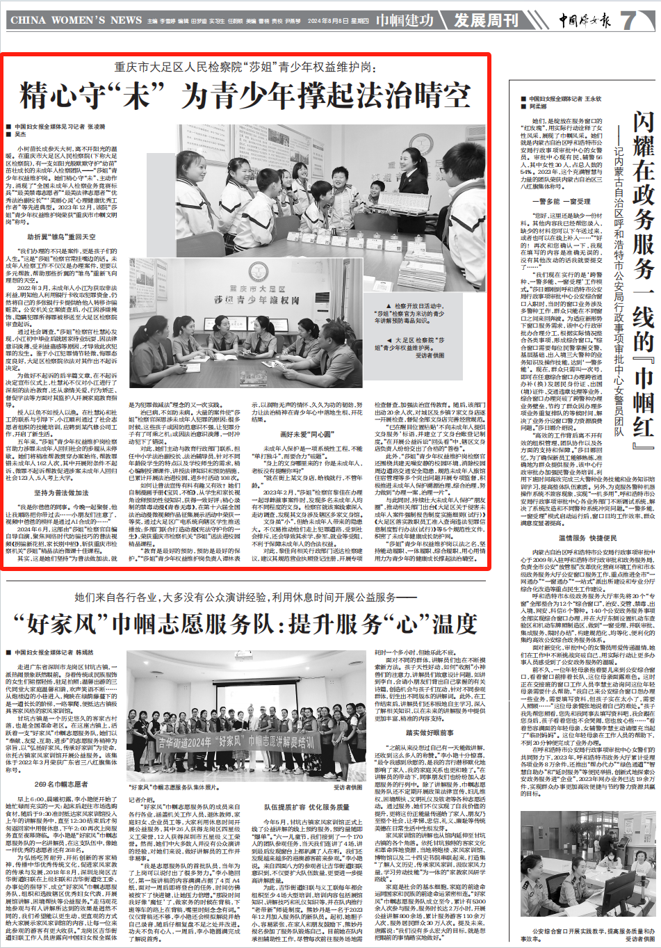 2024年8月8日,《中国妇女报》第7版刊登《重庆市大足区人民检察院“莎姐”青少年权益维护岗:精心守“未” 为青少年撑起法治晴空》一文,内容如下: