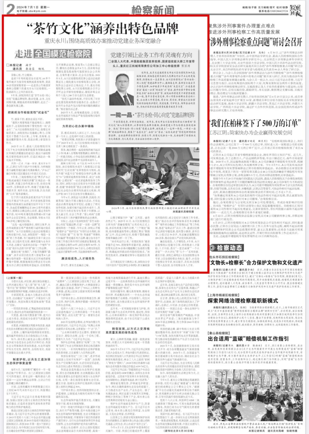 2024年7月1日,《检察日报》第2版 “走进全国模范检察院”专栏刊登《“茶竹文化”涵养出特色品牌——重庆永川:围绕高质效办案推动党建业务深度融合》一文,内容如下: