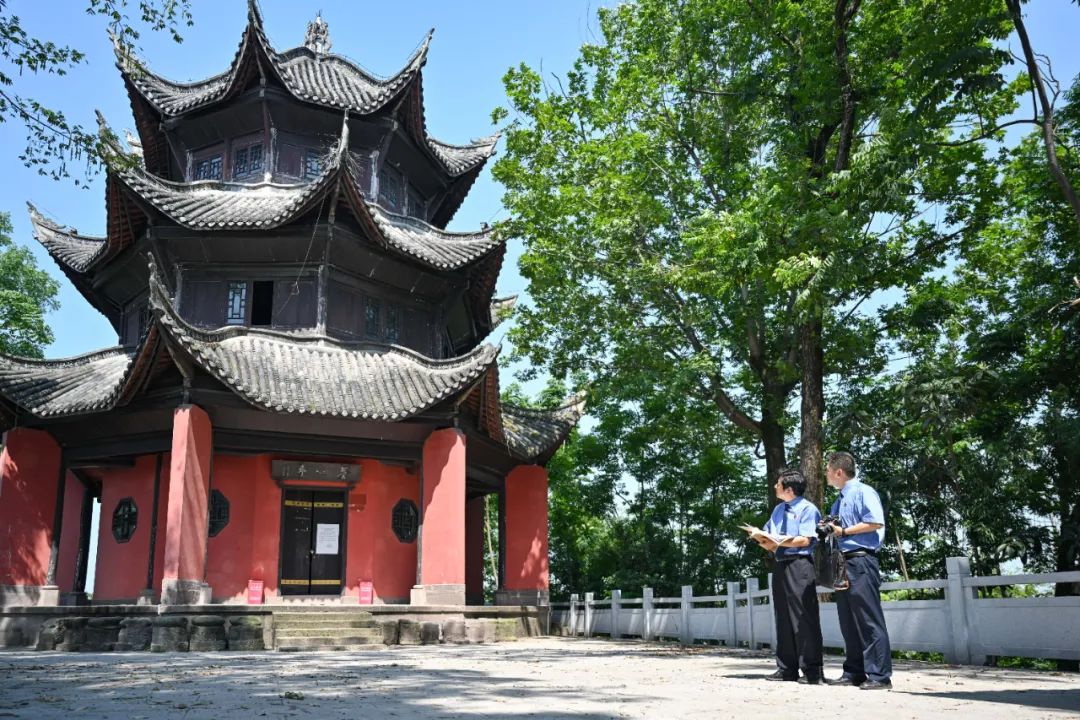 2024年6月,合川区检察院公益诉讼检察官巡查发现,养心亭片区文物保护状况堪忧:灭火箱损毁失效,地坝杂草侵蚀,与之毗邻的养心堂旧址,更挂着醒目的危房标识。特别显眼的是,通往亭宇的小径荒芜难辨,大门紧锁,游客望亭兴叹。