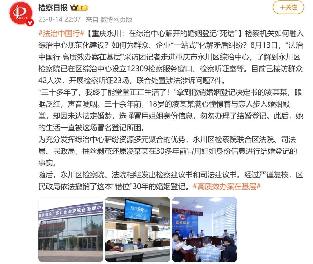 为充分发挥综治中心解纷资源多元聚合的优势,永川区检察院联合区法院、司法局、民政局,抽丝剥茧还原凌某某在30多年前冒用姐姐身份信息进行结婚登记的事实。
