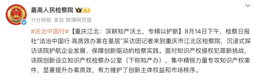 8月14日下午,检察日报社“法治中国行·高质效办案在基层”重庆行记者来到重庆市江北区检察院,沉浸式探访该院护航企业发展、保障创新驱动的检察实践。面对知识产权侵权犯罪新挑战,该院创新设立知识产权检察办公室(下称知产办),集中精锐力量专攻知识产权案件,显著提升办案质效,有力维护了创新主体权益和市场秩序。