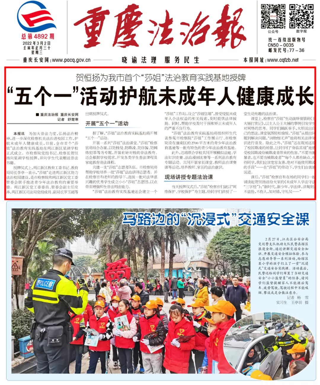 2022年3月2日,《重庆法治报》头版头条刊登《贺恒扬为重庆市首个“莎姐”法治教育实践基地授牌:“五个一”活动护航未成年人健康成长》一文,内容如下: