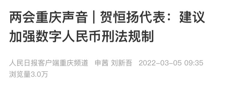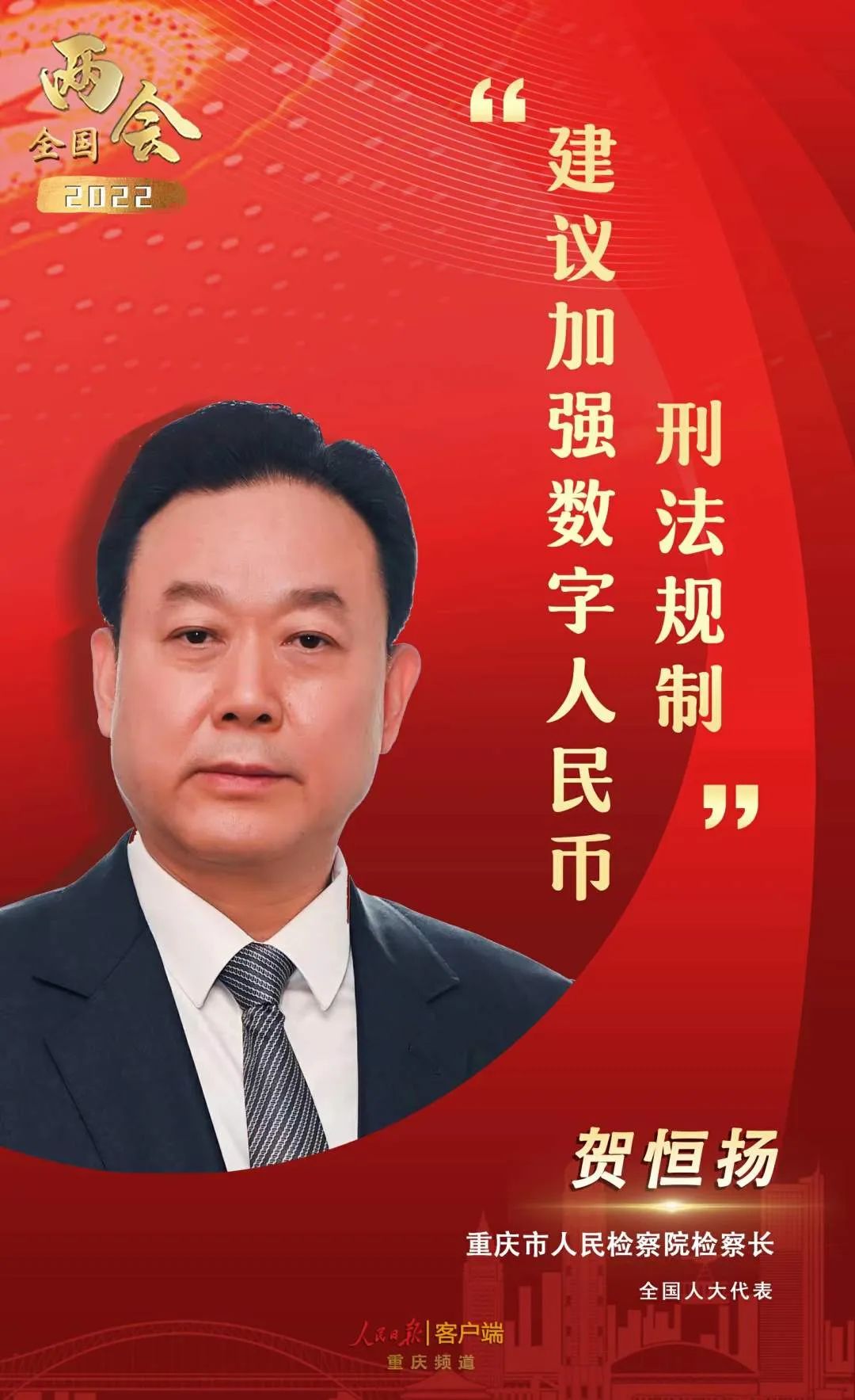 2022年3月5日,人民日报客户端“两会重庆声音”专栏刊登对全国人大代表、188体育(中国)官方网站 党组书记、检察长贺恒扬的采访《建议加强数字人民币刑法规制》,内容如下: