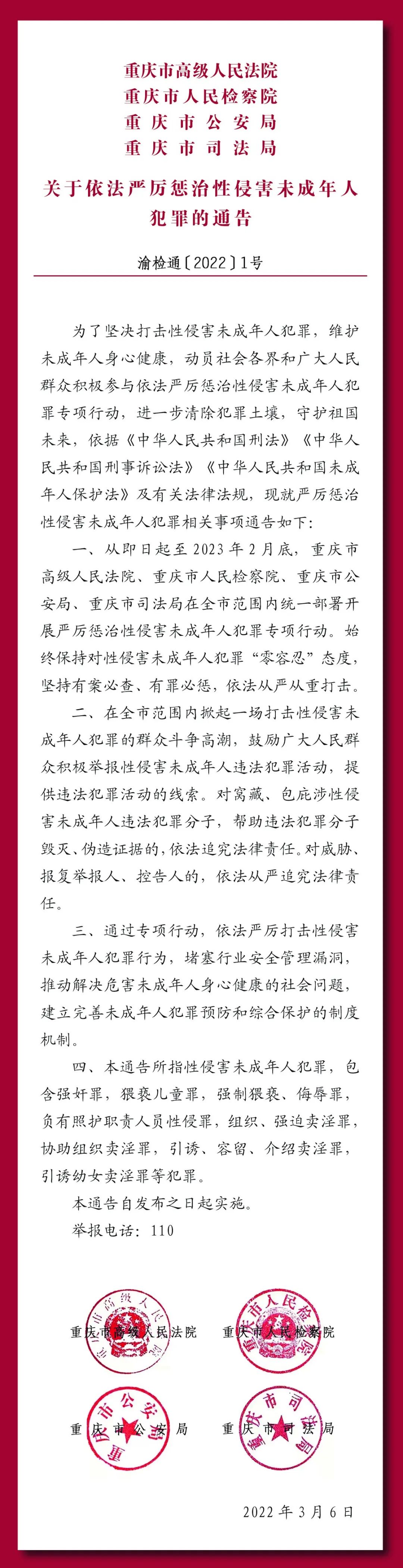 日前,重庆市委政法委、市高级人民法院、市人民检察院、市公安局、市司法局决定从今年3月起在全市开展“共护未来”依法严厉惩治性侵害未成年人犯罪专项行动,旨在通过严厉惩治性侵害未成年人犯罪行为,推动社会治理,清除犯罪土壤,促进未成年人保护法、预防未成年人犯罪法落实落地,共护祖国未来。