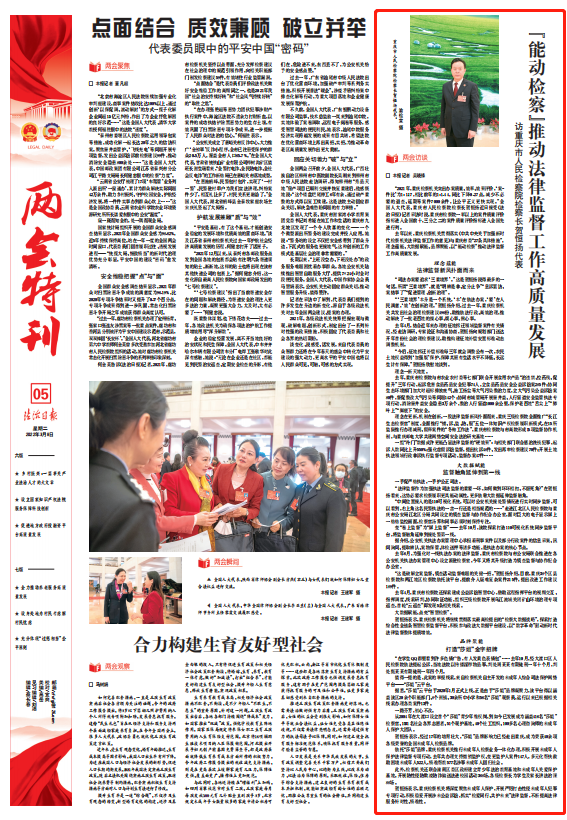 2022年3月8日,《法治日报》第5版“两会特刊”专版刊登《“能动检察”推动法律监督工作高质量发展——访188体育(中国)官方网站 检察长贺恒扬代表》一文,内容如下: