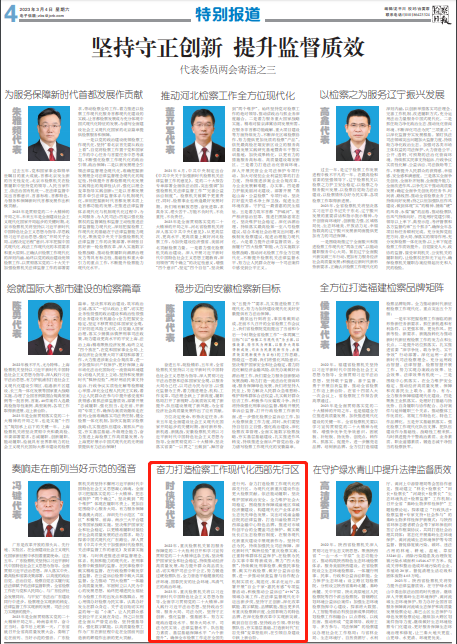 2023年3月4日,《检察日报》第4版“代表委员两会寄语”专栏刊登对全国人大代表、188体育(中国)官方网站