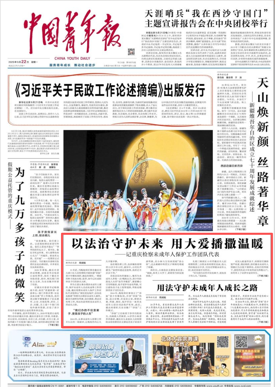 2025年9月22日,《中国青年报》头版转第2版刊登《以法治守护未来 用大爱播撒温暖——记188体育
