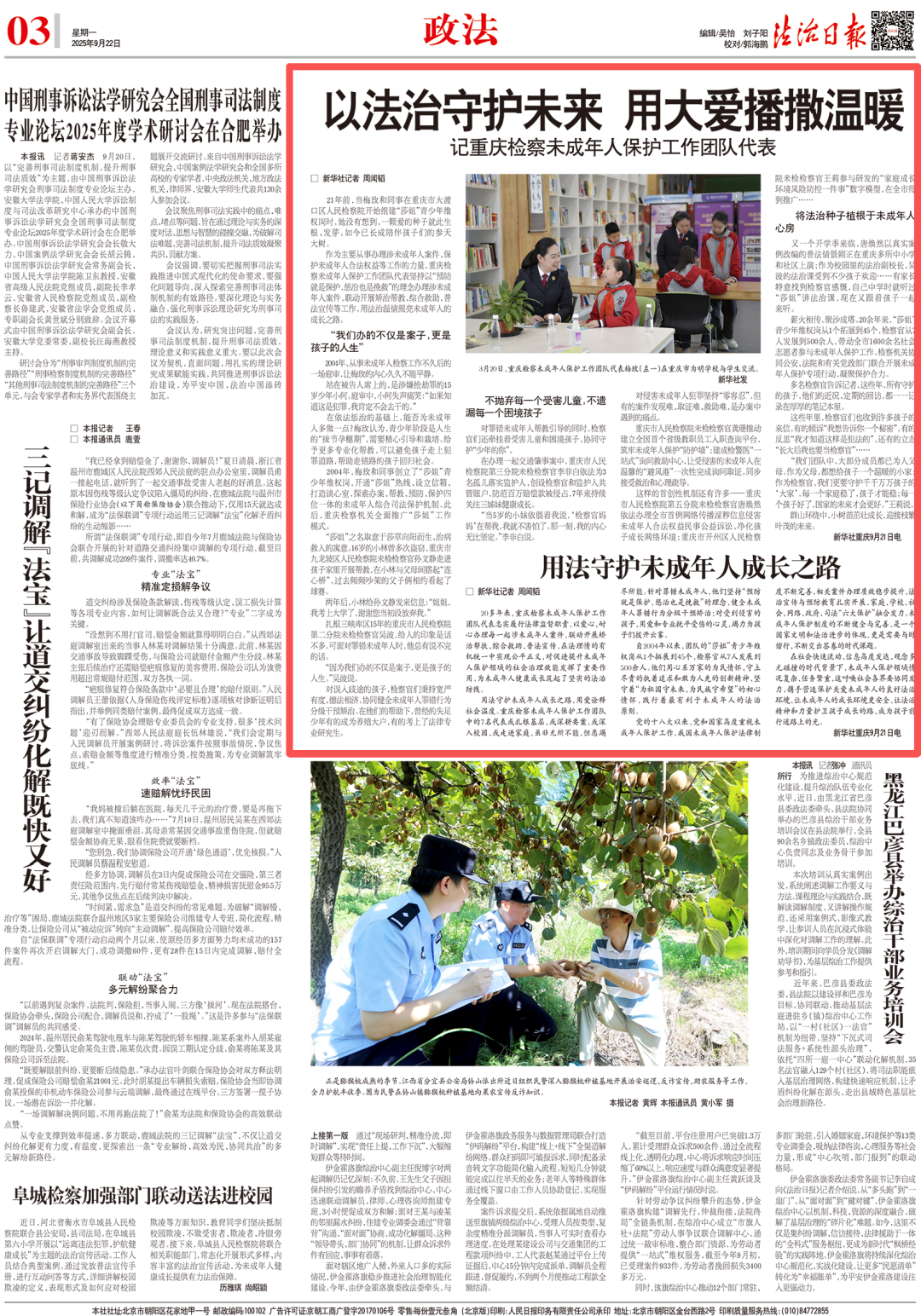 2025年9月22日,《法治日报》第3版刊登《以法治守护未来 用大爱播撒温暖——记188体育