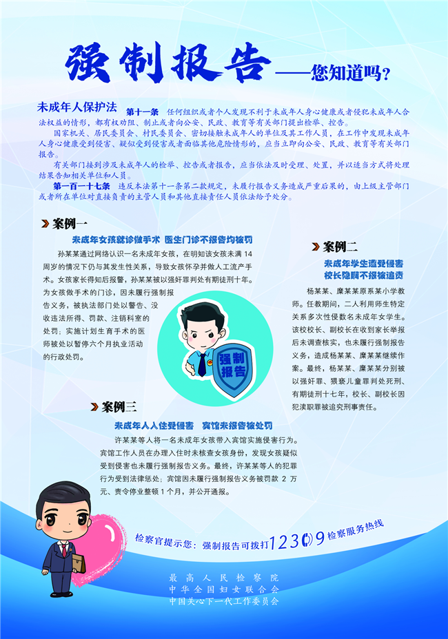 为进一步深化强制报告制度的普法宣传,促进这项制度深入人心,最高人民检察院、中华全国妇女联合会、中国关心下一代工作委员会共同设计制作了《强制报告》宣传海报。最高人民检察院第九检察厅有关负责人介绍,这套海报通过全网发布后,将走进国家机关、中小学校、医疗机构、社区、乡村等场所,让更多的人了解并落实强制报告制度。