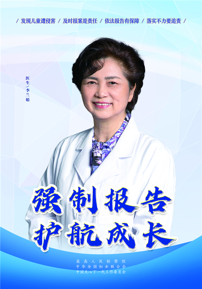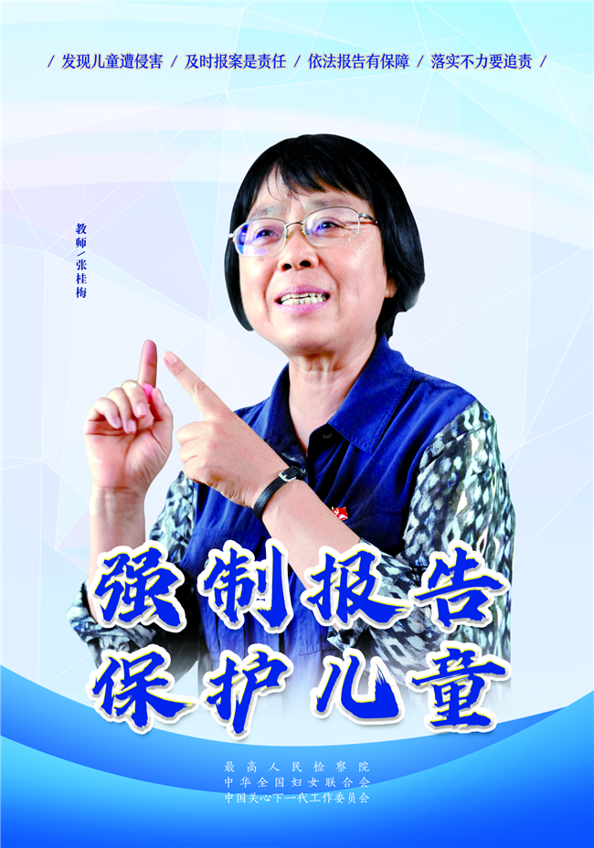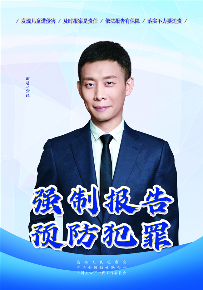 5月27日,最高人民检察院、中华全国妇女联合会、中国关心下一代工作委员会共同发布了一组《强制报告》海报,“七一勋章”获得者、全国优秀教师张桂梅,中国工程院院士李兰娟和中国电影金鸡奖获得者、第五届全国中青年德艺双馨文艺工作者张译齐出镜,为侵害未成年人案件强制报告制度代言。