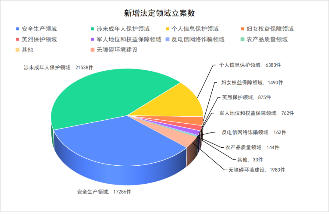 二是新增法定领域快速发展。全年共办理新增十个法定领域案件50656件,占公益诉讼总数的26.7%。其中,安全生产17286件,涉未成年人保护21538件,个人信息保护6383件,妇女权益保障1490件,英烈保护875件,军人地位和权益保障762件,反电信网络诈骗162件,农产品质量144件,无障碍环境建设1983件等。