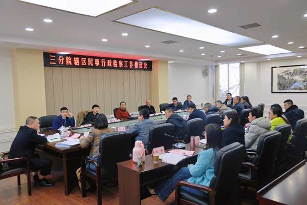 2月24日,三分院召开辖区民事行政检察工作推进会。辖区各区县院分管院领导、部门负责人、业务骨干共20余人参加会议,市院陈祖德专委、检察六部主任徐燕、检察官任志勇到会指导。会上,三级检察机关就一批监督案件线索开展同场论案,对分院起草的《民事行政检察一体化办案工作办法》展开讨论,陈祖德专委就如何能动履职提出了工作要求。
