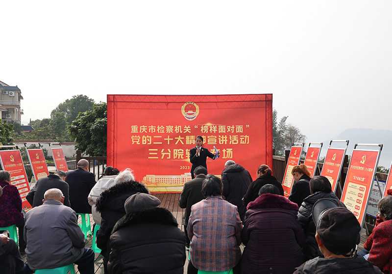我院机关党委副书记邱靖杰结合自身工作经历,从党的二十大会议主要成果和重大意义、领悟党和人民赋予检察机关的更重责任、全面推进乡村振兴的重要性和根本目的等方面,对党的二十大精神进行了深入浅出宣讲。涪陵区检察院长江生态检察官办公室主任李姣从办理的三起典型案例出发,将党的二十大精神从“书面语”变为“家常话”,向大家讲述保护长江生态系统的重要性和破坏生态系统违法行为应承担的法律责任,引导群众共同保护好长江母亲河,走绿色发展乡村振兴之路。