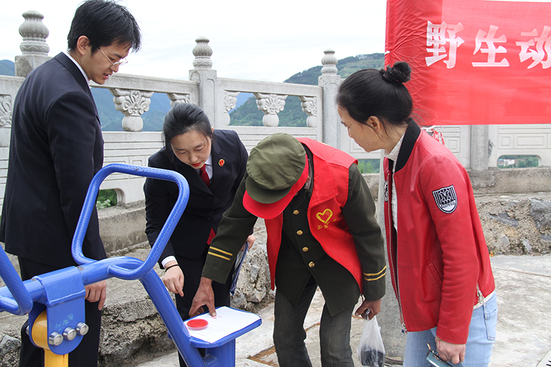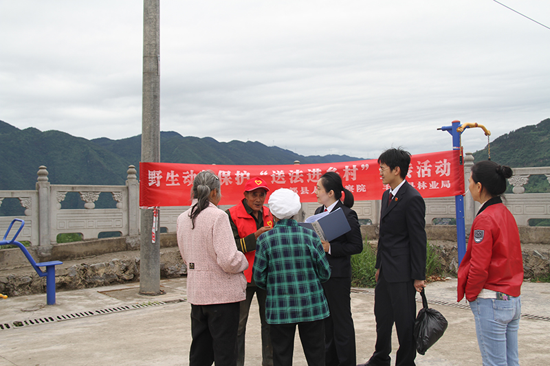 《中华人民共和国野生动物保护法》于2022年12月30日修订,将于2023年5月1日起施行。为宣传该法,4月23日上午,丰都县人民检察院长江生态检察官李秋颖、助理江红卫与林业局的工作人员来到丰都县南天湖镇三扶村开展野生动物保护普法宣传活动。同时,对该村涉嫌非法狩猎罪的村民廖某某进行法治教育,廖某某当场签订了自愿参与社会公益服务承诺书。