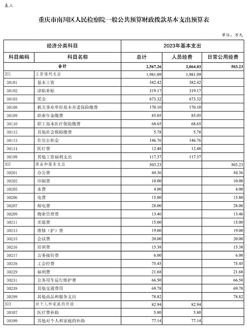 2023年一般公共预算财政拨款收入3004.26万元,一般公共预算财政拨款支出3004.26万元,比2022年增加560.42万元。其中:基本支出2567.26万元,比2022年增加598.12万元,主要原因一是行政参公单位公用经费综合定额人均减少1万元,预算减少72.32万元;二是规范公务员津贴补贴改革后,公务员基础绩效奖和年度考核奖纳入年初预算编制,养老保险、职业年金和住房公积金计提基数调整,年终一次性奖金规范编制,将原项目支出保障的聘任制书记员经费调整为基本支出保障等,共计增加720.11万元;未休假补贴等规范编制减少49.67万元;基本支出主要用于保障在职人员工资福利及社会保险缴费、退休人员补助等,保障部门正常运转的各项商品服务支出;项目支出437万元,比2022年减少37.7万元,主要原因是将原项目支出保障的聘任制书记员经费调整为基本支出保障,项目支出主要用于保障日常办案,业务装备购置和培训等支出。