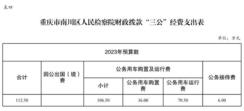2023年“三公”经费预算112.5万元,比2022年减少0.4万元,其中:因公出国(境)费用0万元,与2022年持平;公务接待费6万元,比2022年增加4万元,主要原因是疫情放开,单位间交流学习增多;公务用车运行维护费70.5万元,比2022年减少7.4万元,主要原因是严格落实中央八项规定、厉行节约,规范车辆运行管理;公务用车购置36万元,比2022年增加3万元,主要原因是根据执法执勤需要,本年更新车辆时调整车型配置。