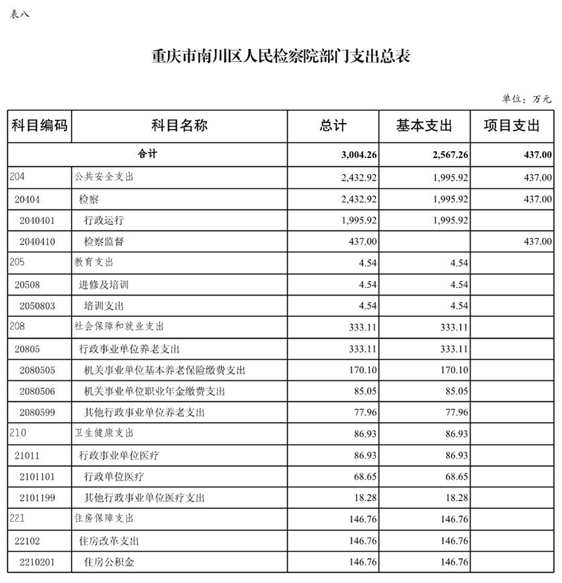 (二)支出预算:2023年年初预算数3004.26万元,其中:公共安全支出2432.92万元,教育支出4.54万元,社会保障和就业支出333.11万元,卫生健康支出86.93万元,住房保障支出146.76万元。支出预算较2022年增加560.42万元,主要是基本支出预算增加598.12万元,项目支出预算减少37.7万元。