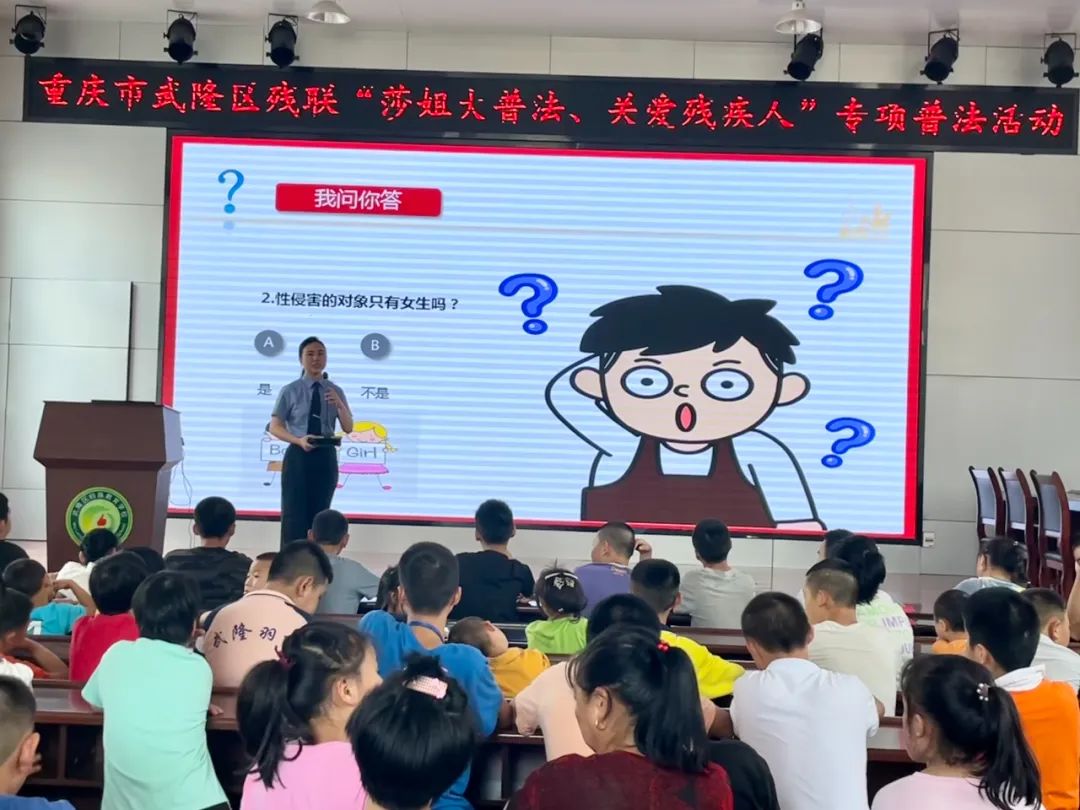 未成年人是祖国的未来、民族的希望。保护好未成年人,是在做“守未守心”的工作 。2023年9月14日,在武隆区特殊教育学校,武隆区检察院联合武隆区残疾人联合会开展“莎姐守未”法治安全教育第一课普法宣讲活动,为全校一百多名学生上了一堂“预防性侵 共护花开”的普法公开课。
