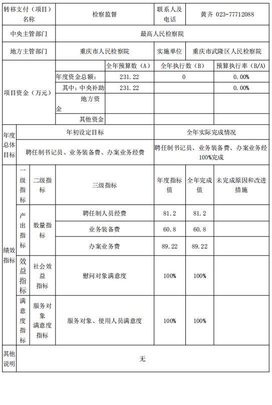 检察监督项目绩效目标自评综述:根据年初设定的绩效目标,项目总体完成情况一级项目总体预算231.22万元,目标完成231.22万元,完成率100%。项目全年预算数为231.22万元,执行数为231.22万元,完成预算的100%。主要产出和效果:一是良好地保障了业务的正常开展,二是满足日常工作的需求。发现的问题及原因,一是对问题还不熟悉,没有预见性,二是对新事物的学习能力还不够,缺乏经验。下一步改进措施,一是继续学习,加强认识,二是加强监督,不断提高,建立科学有效的目标绩效体系。