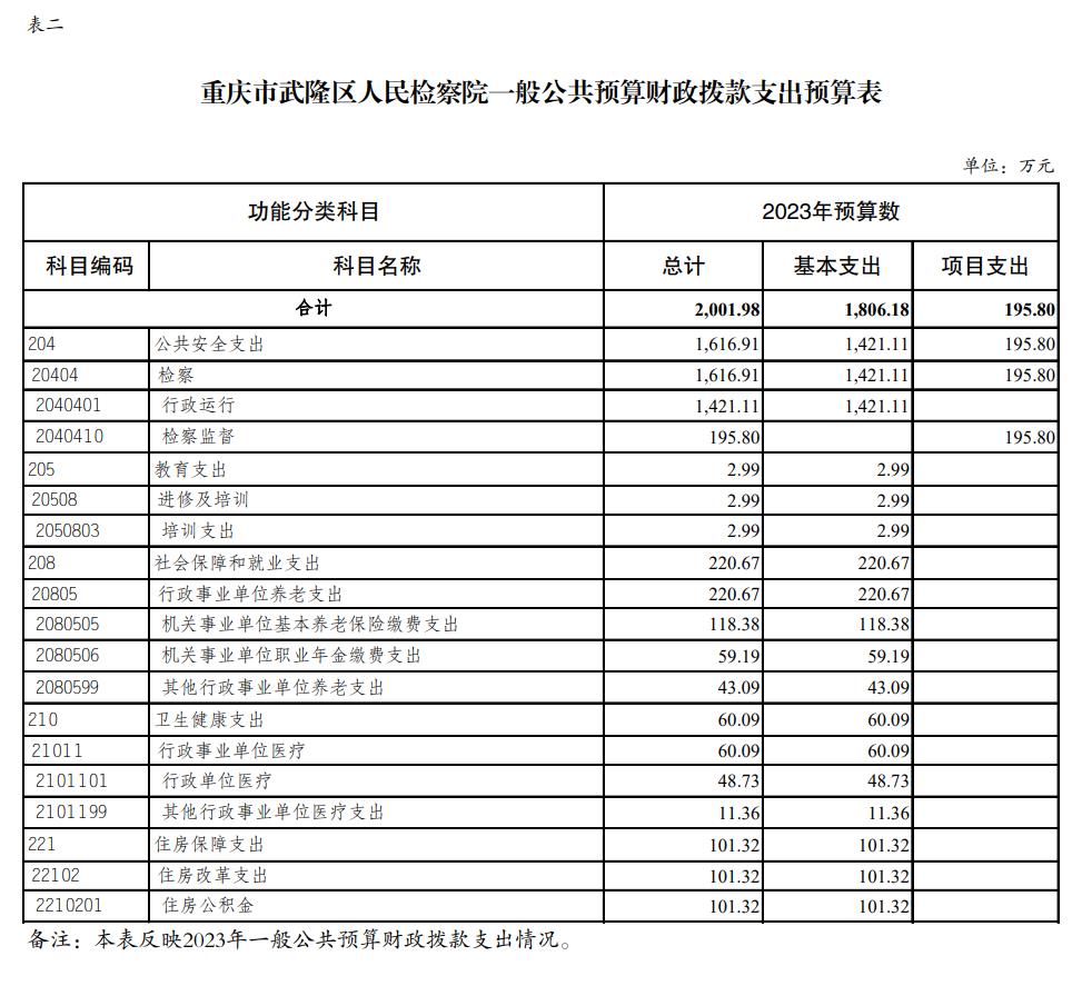 (二)支出预算:2023年年初预算数2001.98万元,其中:一般公共安全支出1616.91万元,教育支出2.99万元,社会保障和就业支出220.67万元,卫生健康支出60.09万元,住房保障支出101.32万元;支出较去年增加250.41万元,主要是基本支出预算增加399.45万元,项目支出预算减少149.04万元。